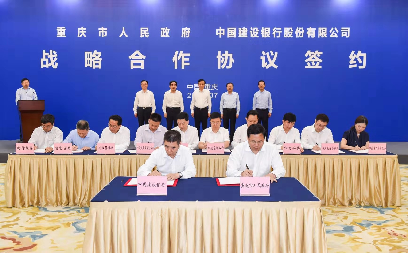 7月15日,重庆市人民政府与中国建设银行股份有限公司签订战略相助协议和8个子协议。市委书记陈敏尔,市委副书记、市长唐良智,中国建设银行股份有限公司党委书记、董事长田国立和行长刘桂平等领导配合见证。作为8个子协议之一,重庆对外AG真人国际集团与中国建设银行重庆市分行签订战略相助协议,相助规模不低于100亿元。重庆对外AG真人国际集团成为现场签订战略相助协议的两家市属重点国企之一。